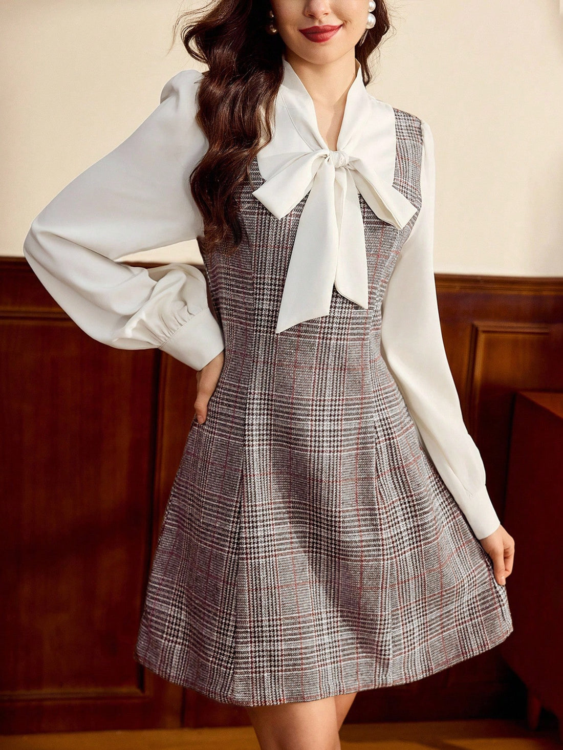 Women’s Woven Fabric Dress, Long Sleeve Collar Design, Plaid Pattern, 2 In 1 Style, 1 Piece, For Autumn and Winter Wear