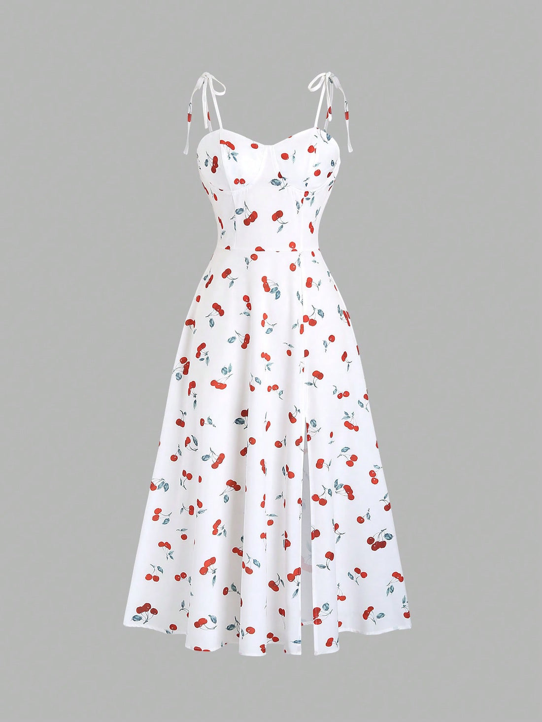 Fruit Print Maxi Dress Neutral Color Single Piece Sleeveless Strap Knot Detail Design For Casual Wear