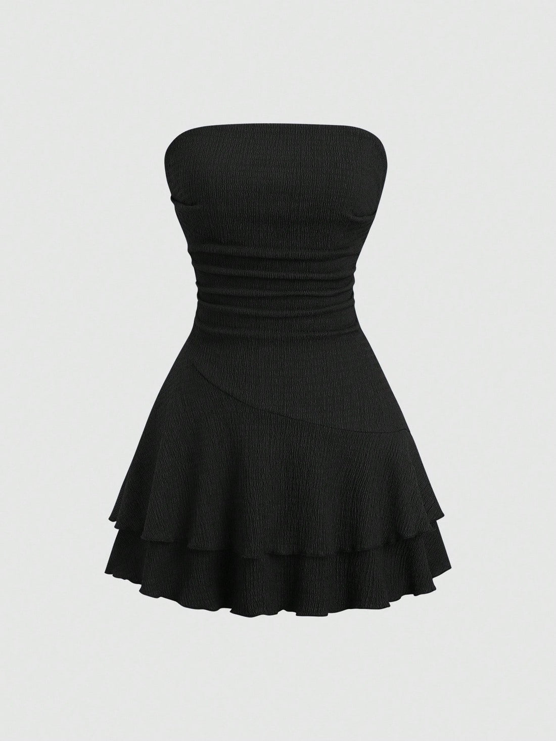 Details: Ruched, Ruffle Hem, Tiered LayerBody: UnlinedNeckline: StraplessPattern Type: PlainStyle: CasualType: A LineWaist Line: Natural(Mid...