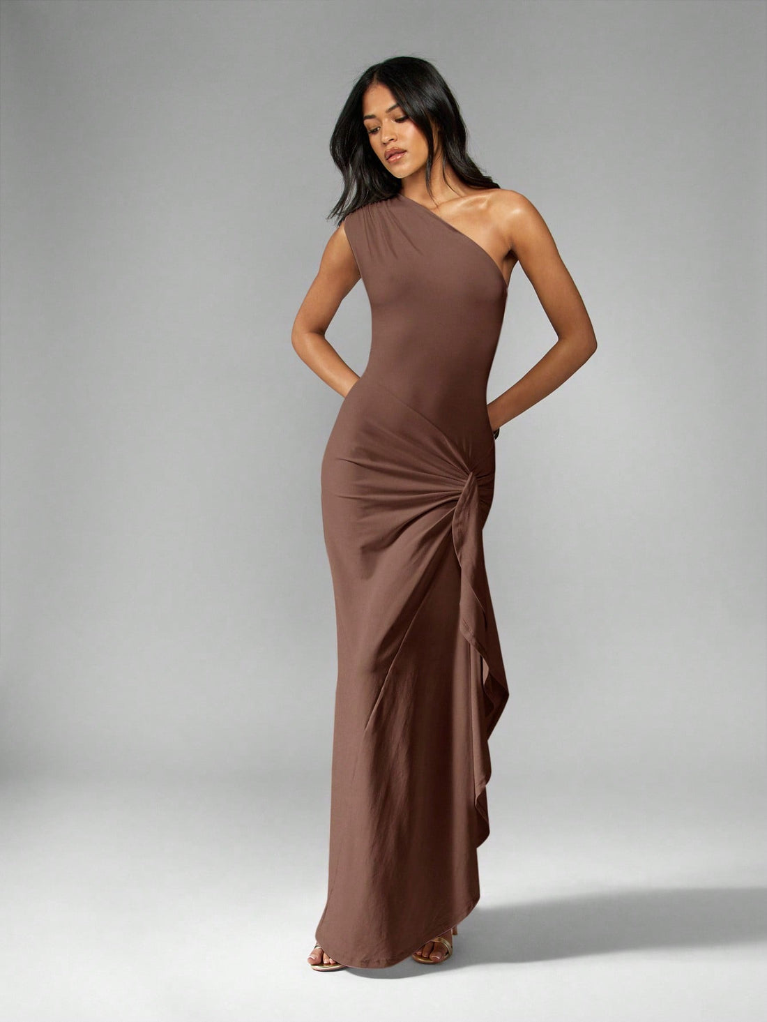 One-Shoulder Draped Evening Gown with Ruched Side Split for Formal Events and Parties