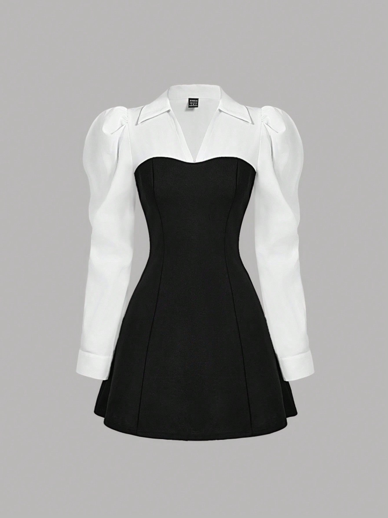 Black and Blue Color Block Shirt Dress with Puff Sleeves Short Length for Everyday Wear
