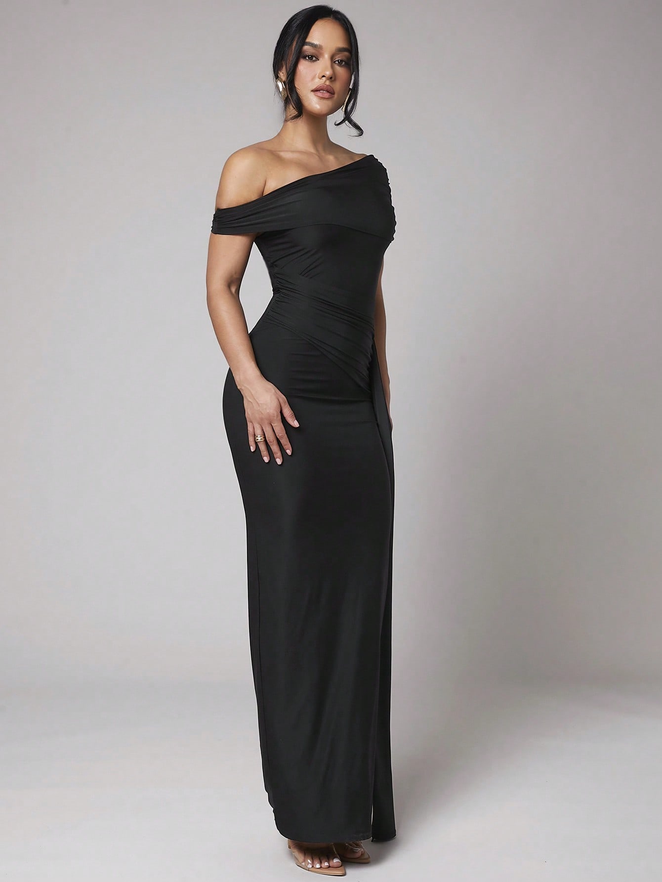 Black Long Asymmetric Ruched Chiffon Maxi Dress for Casual, Formal, Vacation, and Evening Occasions