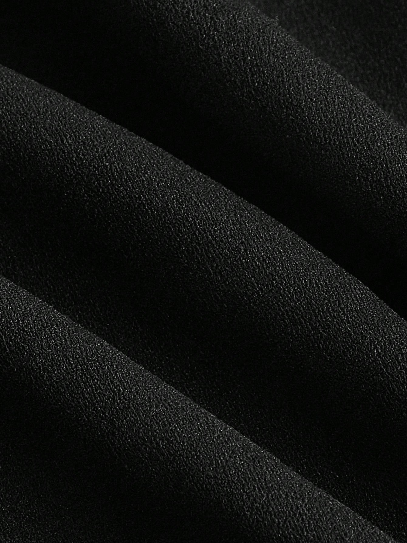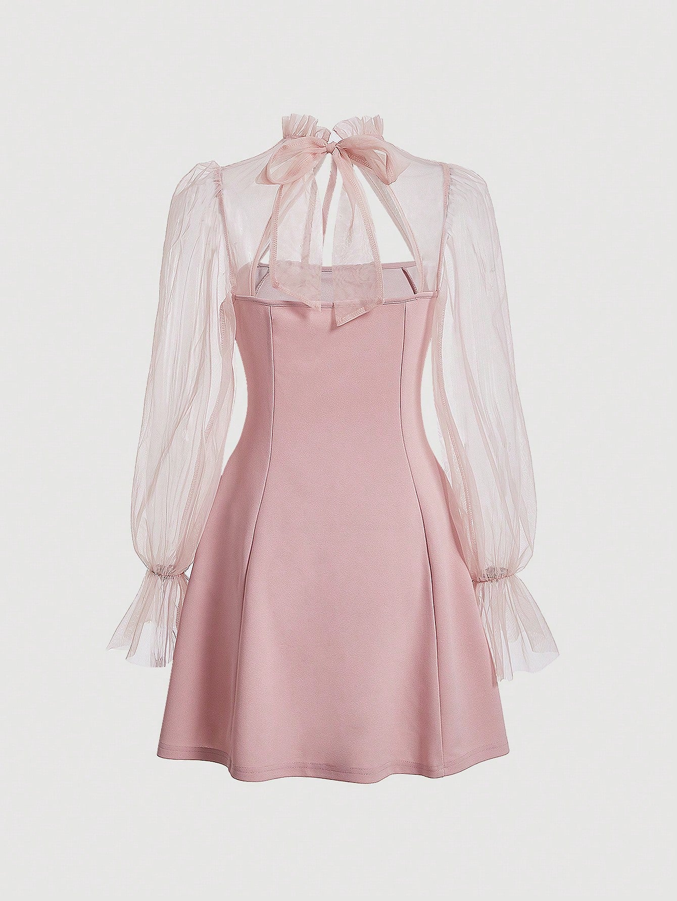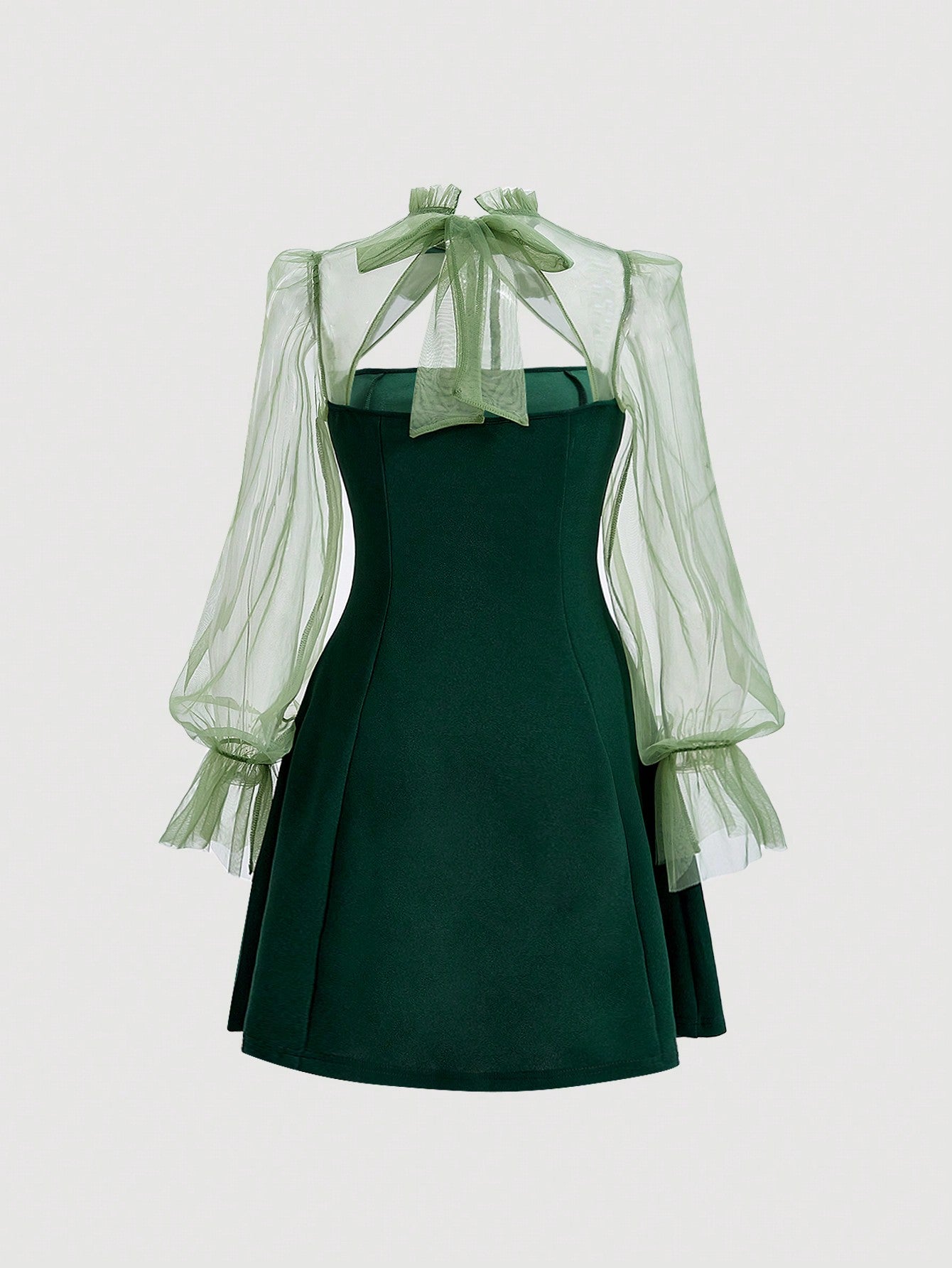Black Long Sleeve Dress with Contrast Mesh Detail Flare Sleeves Tie Neck and High Collar Design