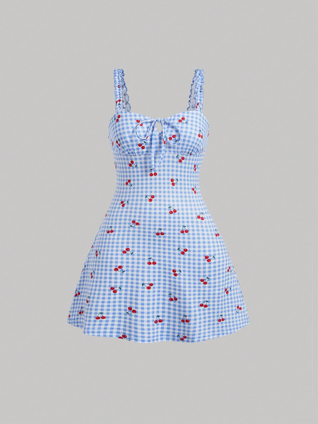 Cherry Print Gingham Dress Neutral Color Single Piece Sleeveless Strap Design For Casual Wear