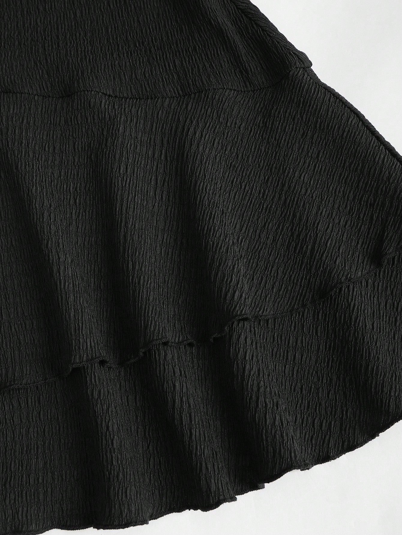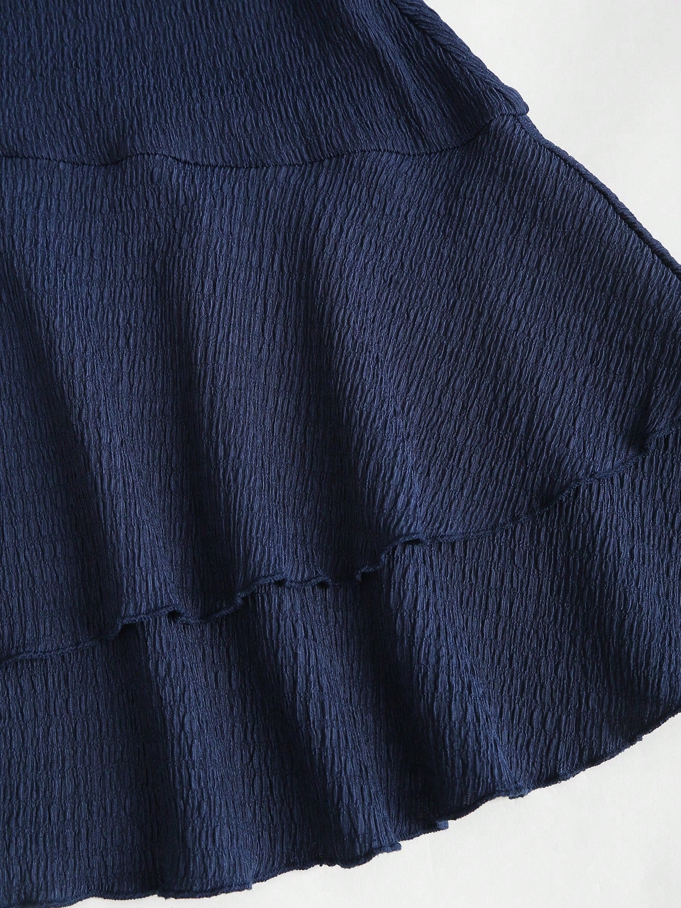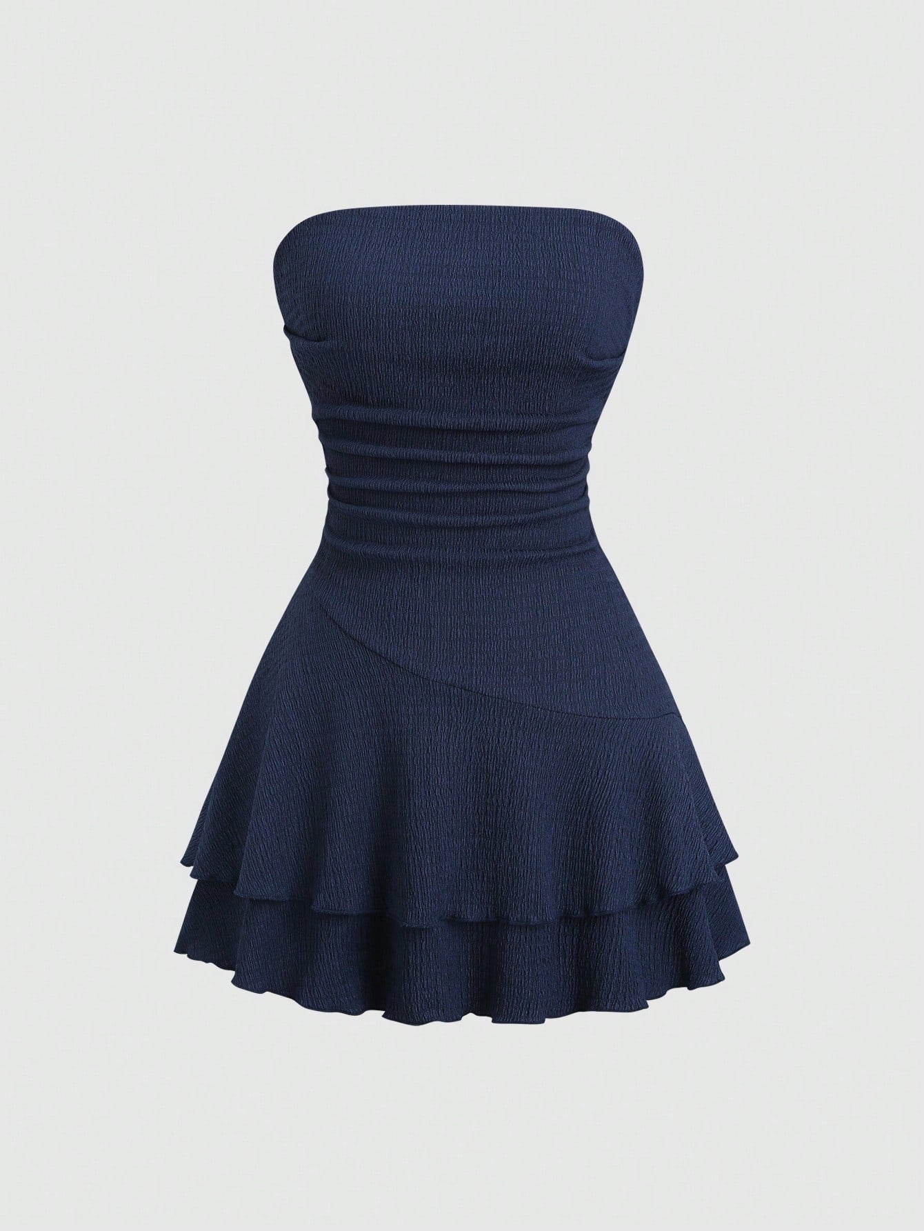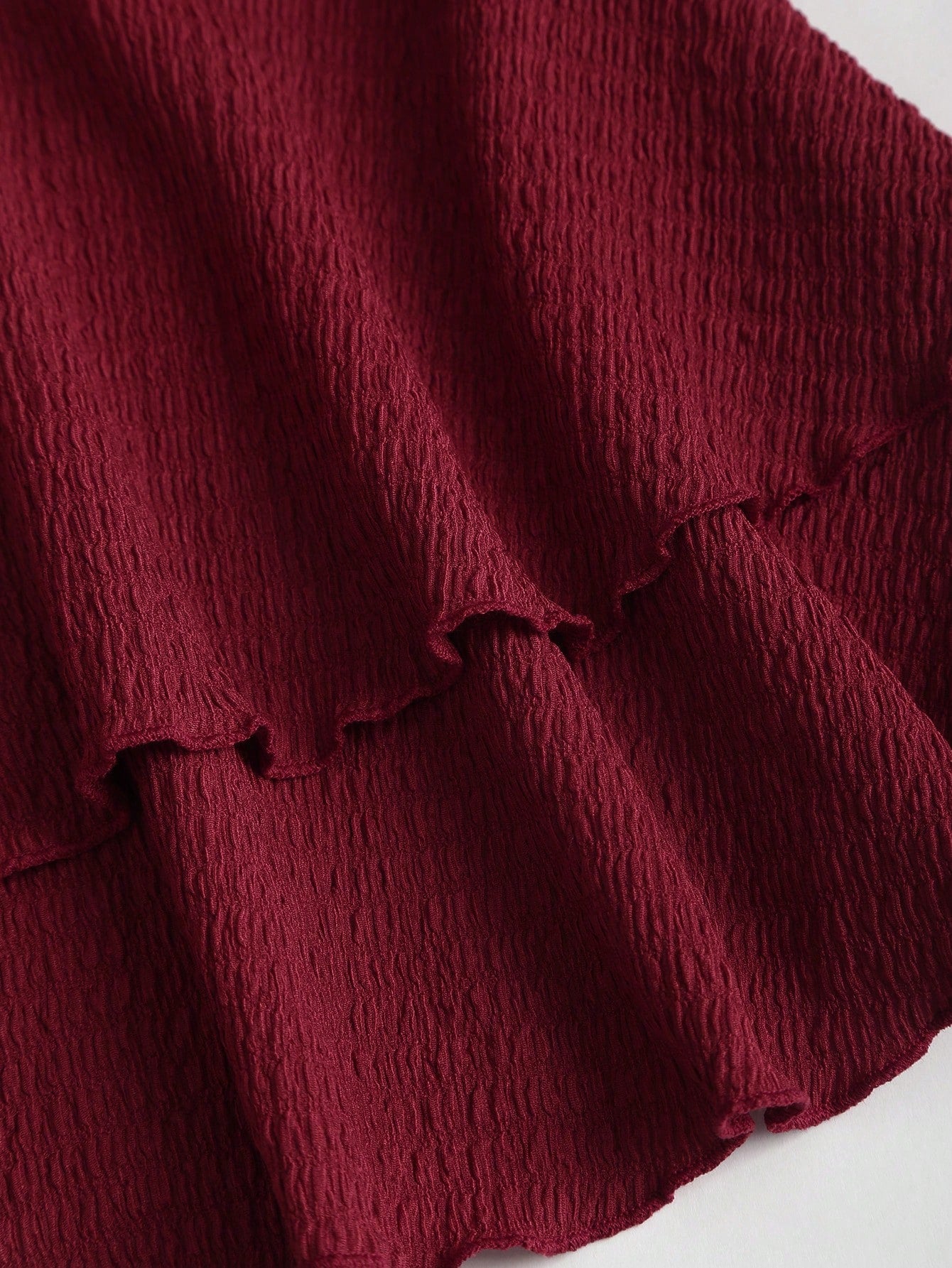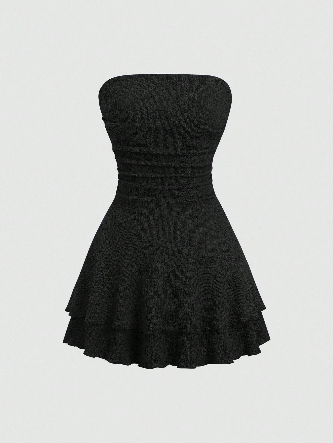 Details: Ruched, Ruffle Hem, Tiered Layer