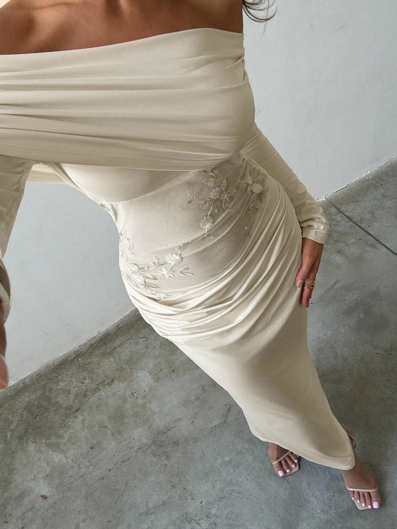 Off-Shoulder Waist Splice Embroidered Fitted Party Dress in Beige for Birthday, Wedding, and Evening Events