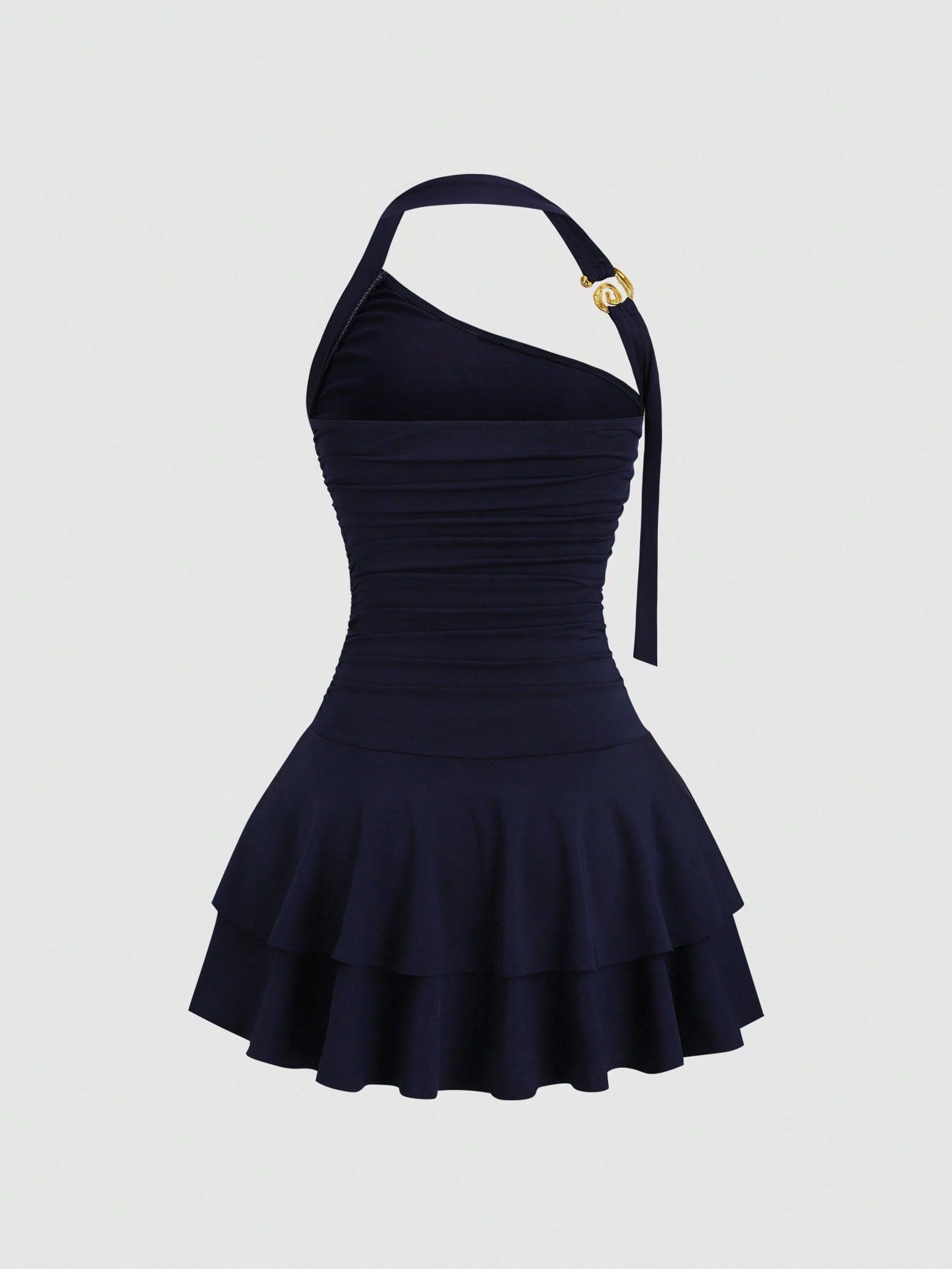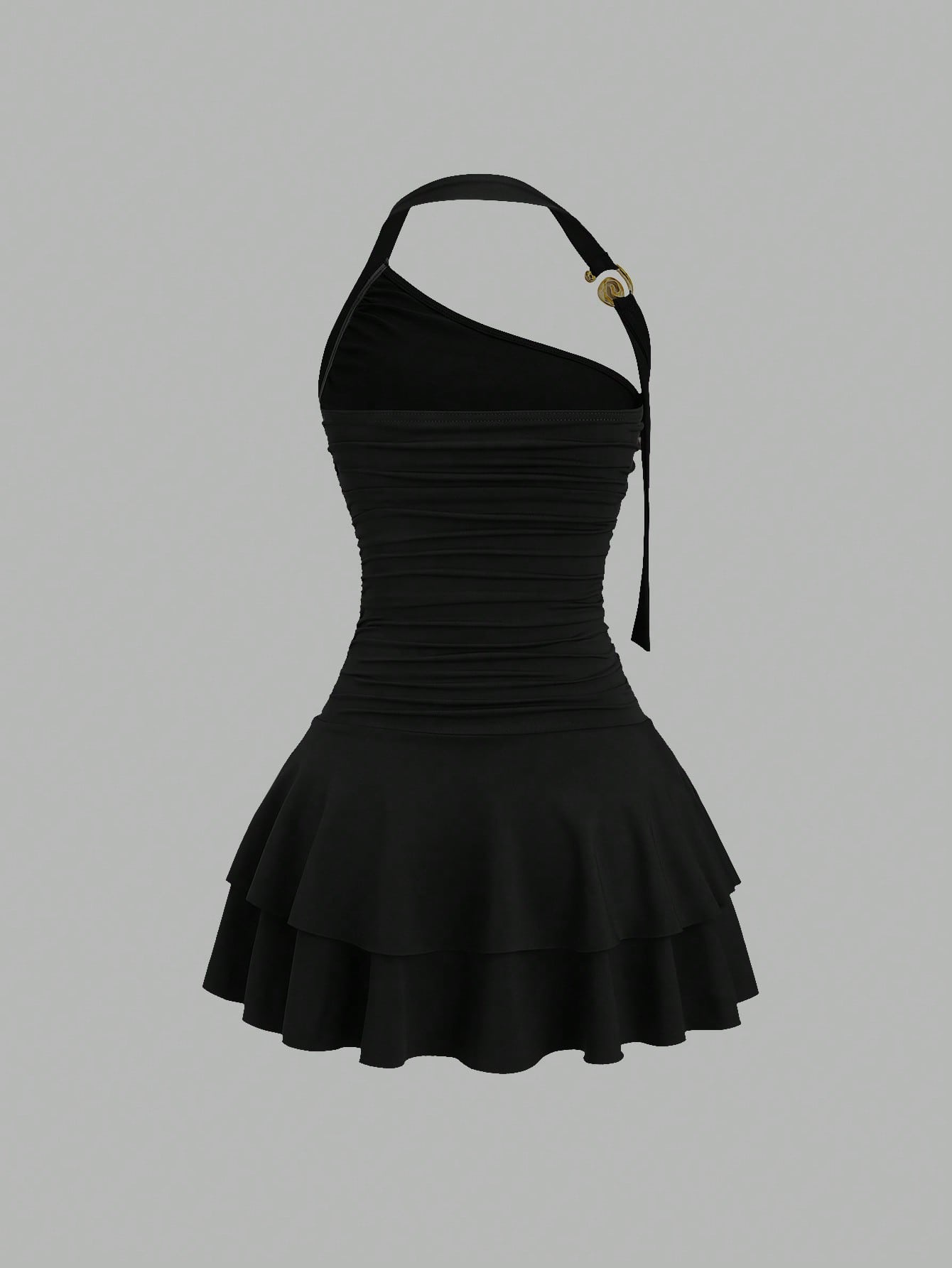 Details: Backless, Ruched, Tiered Layer