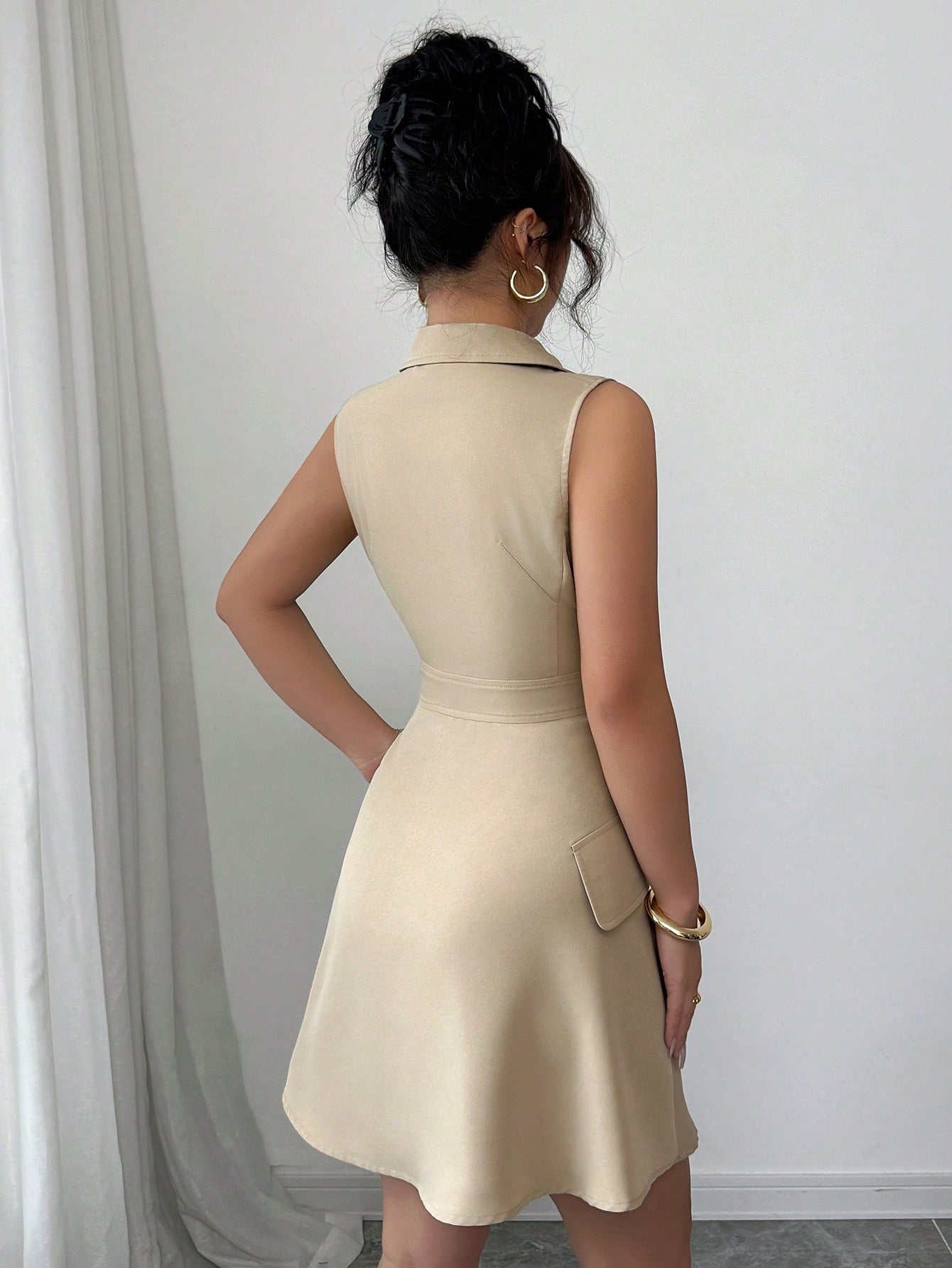 Women’s Woven Fabric A-Line Short Dress, Sleeveless Shirt Collar Design, Double Breasted Detail, 1 Piece, For Commuting and Daily Wear