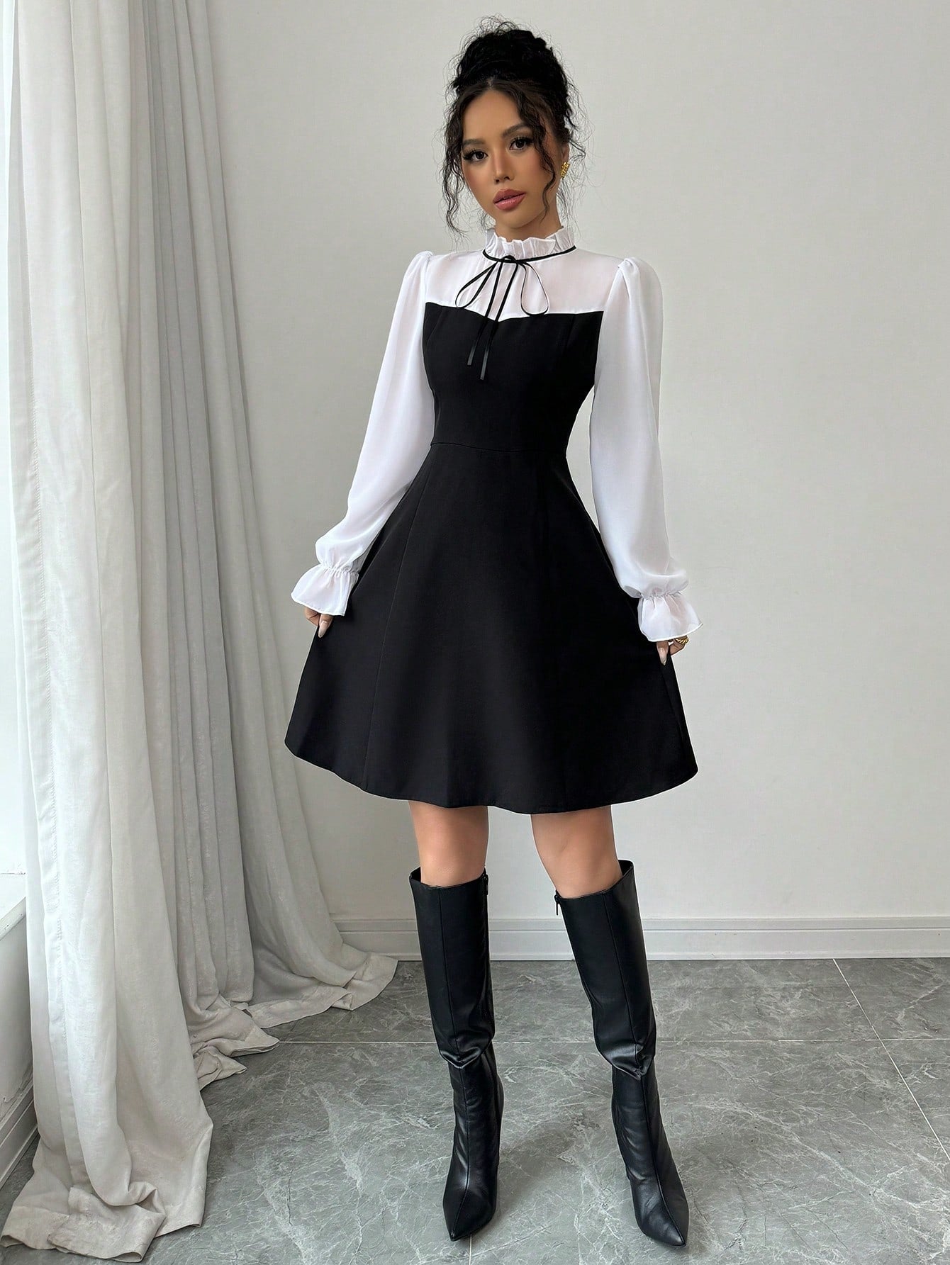 Women’s Woven Fabric Long Sleeve Dress, Stand Collar Tie Detail, Ruffle Hem Design, 1 Piece, For Autumn Wear